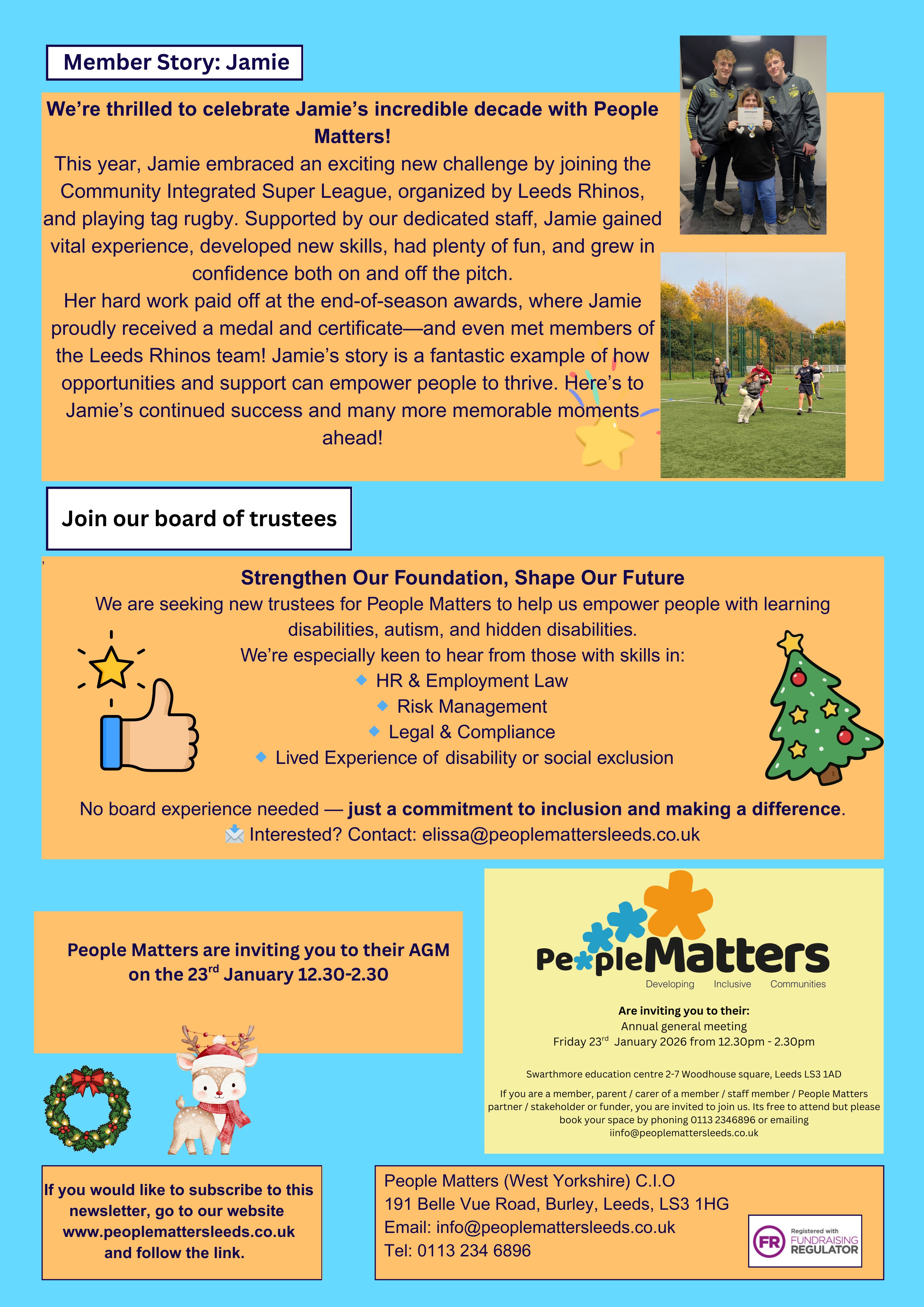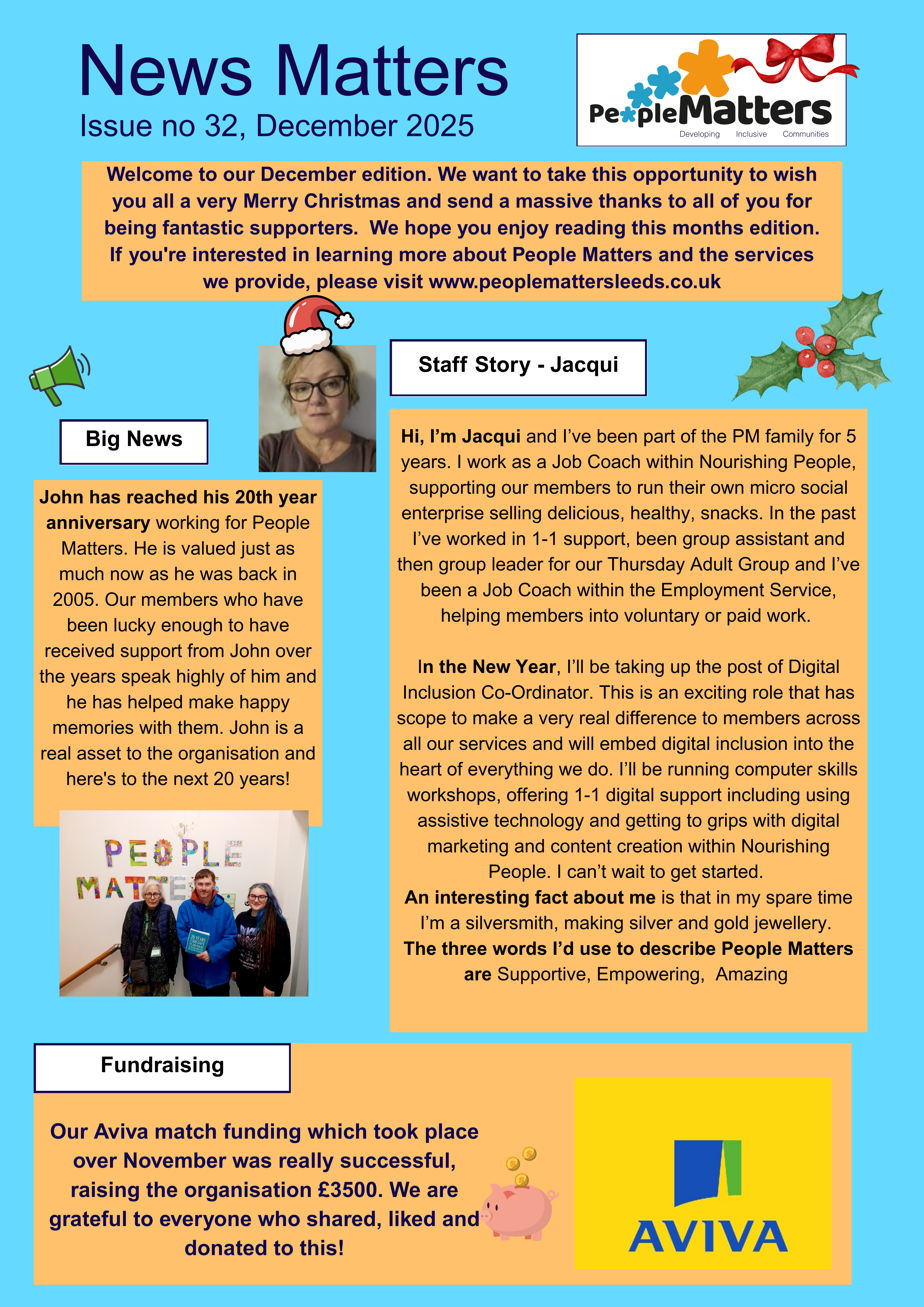 We publish a monthly newsletter that lets people know what we’ve been doing at People Matters and how you can support us.
